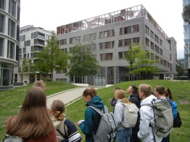 Im Geographie-Unterricht steht die Stadt- und Raumplanung im Lehrplan. Nachdem Herr Meyer schon im 1. Halbjahr die theoretischen Aspekte mit der Klasse erarbeitet hatte, ging es nun darum, die erlernten Unterrichtsinhalte auch vor Ort anzusehen. Mit der Aufgabe einen Steckbrief über ein beliebiges Gebäude aus diesem Areal zu schreiben, haben die Schüler eine Führung von zwei Studenten bekommen, die selbst an die Planung einiger Gebäude beteiligt waren.