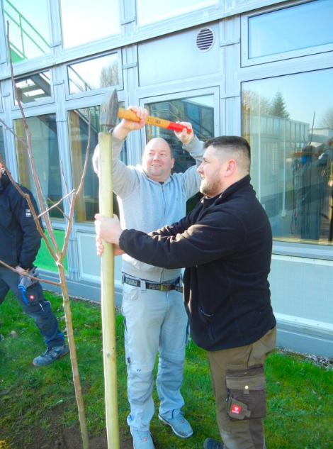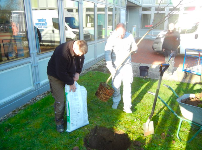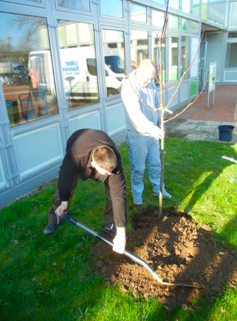 Anlässlich der Verabschiedung unseres stellvertretenden Schulleiters Willy Jahn in den Ruhestand überlegten seine anderen Schulleitungskolleginnen und -kollegen, was denn ein angemessenes und nachhaltiges Abschiedsgeschenk wäre. Viele Ideen kamen auf und wurden wieder verworfen, bis dann die Idee, einen Baum zu pflanzen alle in der Runde begeisterte. Aber es sollte ein Nutzbaum sein, und so kamen wir auf einen Apfelbaum. Der zukünftige Standort war das nächste Problem, viele Vorschriften und Vorgaben waren zu berücksichtigen, aber seit einiger Zeit steht er! Nämlich auf der Rasenfläche links vom Haupteingang, vor den Werkräumen. Die beiden Hausmeister des Schulzentrums haben ihn fachmännisch eingegraben und mit einigen Stöckern gesichert, so dass er hoffentlich noch viele Schülergenerationen überstehen wird. Alle zusammen mit Willy Jahn haben wir ihn am Tag der Verabschiedung eingeweiht. Und – trotz einiger Skepsis bezüglich des Standortes – macht sich der Apfelbaum schon ganz gut: Die erste Sommersaison hat er dank regelmäßiger Wasserspenden gut überstanden, der Blätterwuchs zeigt uns, dass er auch angewachsen ist. Nun warten wir auf die ersten Äpfel, die wohl hoffentlich schon in der nächsten Sommersaison wachsen könnten. Und wenn noch nicht – egal, wir werden in schon soweit hegen und pflegen, dass er bald nicht anders kann, als zu blühen und Früchte auszubringen.