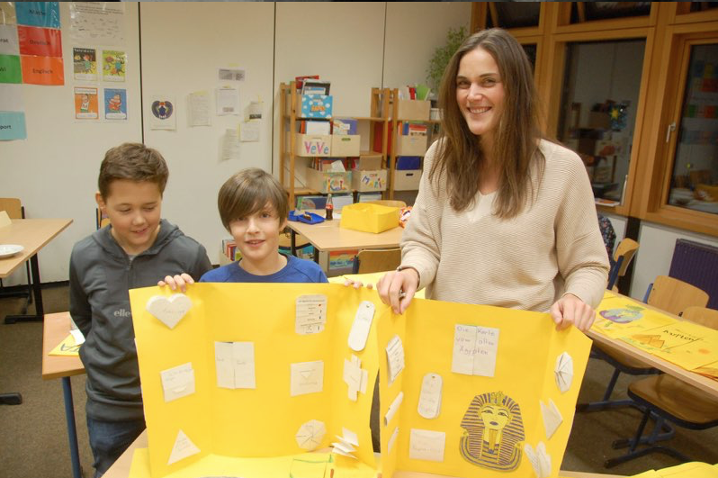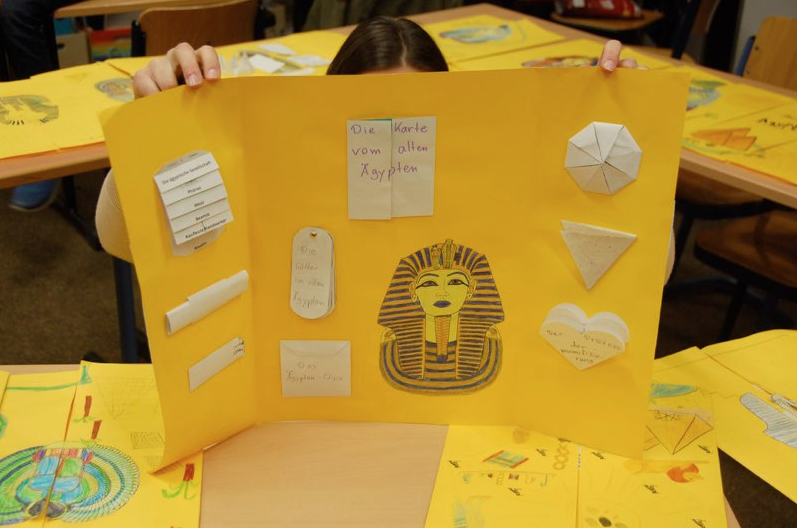 Der 5. Jahrgang hat sich in der letzten Kompaktwoche mit Hochkulturen, insbesondere dem Alten Ägypten, beschäftigt. Dieses Thema griffen fast alle 5. Klassen in ihren Ausstellungen für die Sternstunden auf. Die Kinder stellten ihre Lapbooks aus, die in der Kompaktwoche erarbeitet worden sind. Das sind Faltbücher, ähnlich wie Poster, die sich aufklappen lassen, die mit mehreren Taschen und Türchen ausgestattet sind. In diesen Türchen werden verschiedene Unterthemen erklärt oder dargestellt. Auf diese Weise können sich die Lernenden viele Aspekte, die sie an einem Thema interessant finden, erarbeiten und in ihrem persönlichen Lapbook darstellen. Außerdem lernen sie das selbstständige Recherchieren, wie den Umgang mit Wissensquellen aus dem Internet, der Bibliothek und aus Büchern.