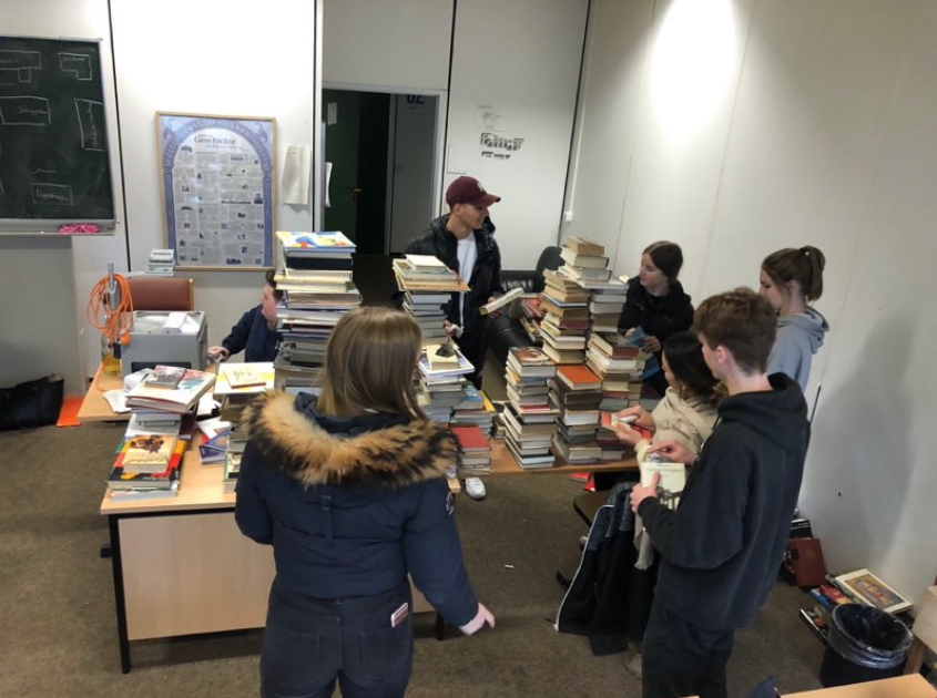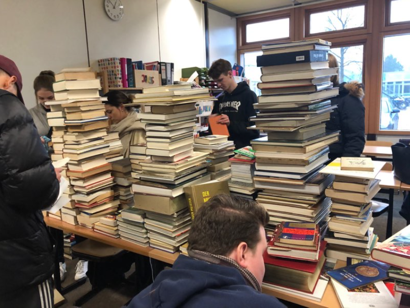 Das zeitliche Zusammentreffen von der Schenkung einer Bibliothek und dem Termin der Sternstunden ließen die Klasse 12c auf die Idee kommen, die Bücher für einen guten Zweck gegen eine Spende abzugeben. Da wussten die Klasse und ihr Klassenlehrer aber noch nicht, welche Büchermengen da auf sie zukommen sollten. Als dann aber der Anhänger mit der Riesenmenge an Büchern aller Art, von Romanen über Reiseliteratur bis hin zu Sachbüchern aller Wissensgebiete vor der Schule stand, war das Erstaunen groß. Zum Glück gab es gerade einige freie Regale, so dass die Klasse eine ganze Raumseite voller Regale aufstellen konnte. Ein anderer Teil der Klasse begann die Bücher nach Sachgebieten zu sortieren und ein weiterer Teil, diese für den Tag der Sternstunden erst einmal zu entstauben und die Buchumschläge mit feuchten Tüchern zu polieren. Dies zog sich über mehrere Tage, immer mal wieder in den Unterrichts- und Mittagspausen, hin und verwandelte allmählich den Klassenraum in ein Antiquariat.