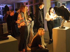 Schlussendlich sind insgesamt 18 spannende und originelle Objekte entstanden, die unbedingt einer größeren Beachtung bedurften. So bauten beide Kurse Anfang Februar zusammen mit ihrer Lehrerin Frau Steinborn im Blumenflur eine Ausstellung auf. Leider war diese längst nicht so gut besucht, wie sie es eigentlich verdient hätte. Einige wenige Exemplare des Modedesigns werden noch einige Zeit zu sehen sein, alle anderen Objekte mussten jedoch aus Sicherheitsgründen leider gleich nach der Ausstellung wieder entfernt werden.