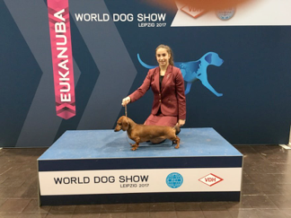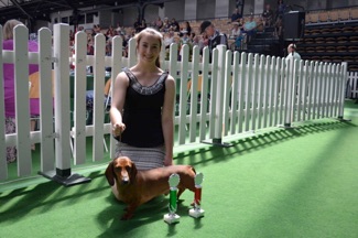 Ich, Eileen Tausendfreund, bin Schülerin in der Oberstufe der der Peter- Ustinov Schule. Ich habe ein außergewöhnliches Hobby, nämlich „Junior Handling. Ich mache dieses Hobby seit 10 Jahren. Dass sind Schönheits-Hundeausstellungen für Jugendliche unter 18. Man kann sich das so vorstellen: Ich habe meinen Dackel an einer ganz dünnen Stoffleine, auch Showleine genannt, an der Hand und gehe mit ihm dann in eine Halle, wo ein abgesperrter Bereich nur für uns Junior Handler ist. Dieser Bereich, auch Ring genannt, ist meistens mit Teppich ausgelegt, damit der Hund beim Laufen nicht wegrutscht. Es gibt einen Sprecher, der einen aufruft, wenn man rein darf. Der Richter begutachtet einen ganz genau, wie harmonisch das Zwischenspiel zwischen Mensch und Hund aussieht. Da ein Dackel sehr klein ist läuft man in einem normalen Tempo, so wie man auch spazieren gehen würde, nur dass der Hund ganz dicht an den Beinen der Hundeführerin läuft. Je nach dem was für eine Rasse man präsentiert geht man mit dem Hund oder läuft. Das Ziel ist es immer beim Einlaufen so gut wie möglich sich und den Hund zu präsentieren.